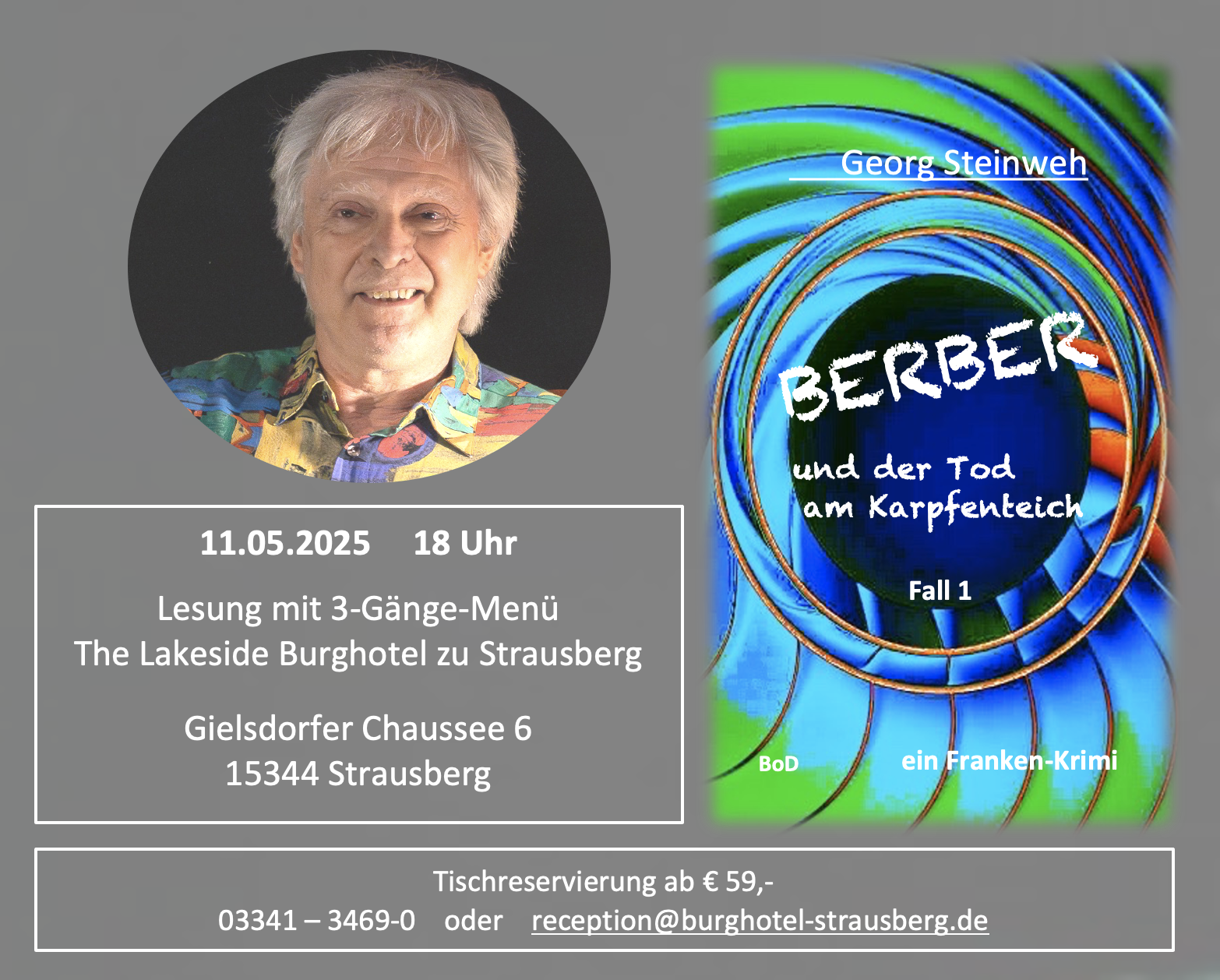 Betzenstein ist Wiederholungs-Süchtig. Hier hatte ich schon "BERBER und der Tod am Karpfenteich" gelesen. Jetzt muss es unbedingt Fall 2 sein. BERBER wird das alles nur mithilfe seiner coolen Tochter Lisbeth überstehen. Und ich? Nur mithilfe meiner Töchter – und der Gattin selbstredend. Vorbeikommen, zuhören, schmunzeln. Über die Krimis zwischen Witz und Totschlag.